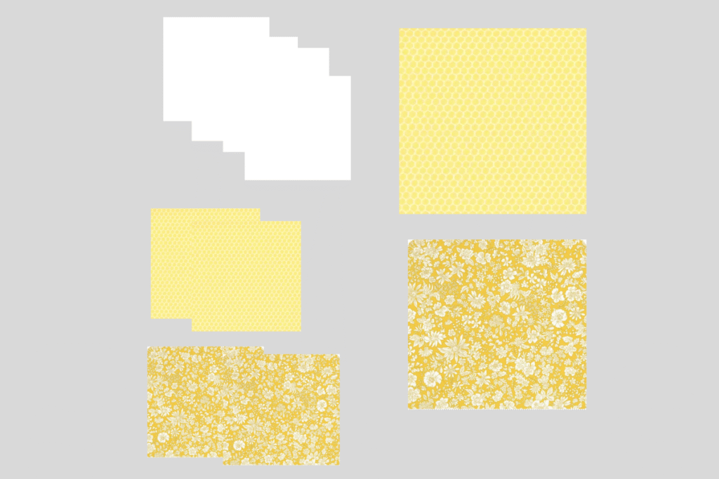 - Light Yellow: 1 – 4.5″ square, and 2 – 2.5″ squares